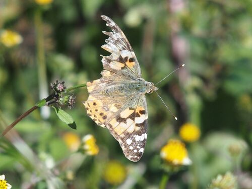 アイノコセンダングサに戯れるツマグロヒョウモン(チョウ目タテハチョウ科)の雌。 ああ、でも、翅がボロボロ。 懸命に生きているのですね。 明日の朝は、ぐんと冷え込むらしいけれど、花の蜜で元気をつけて、一日も長く頑張ってほしい。 カメラを見つめる…